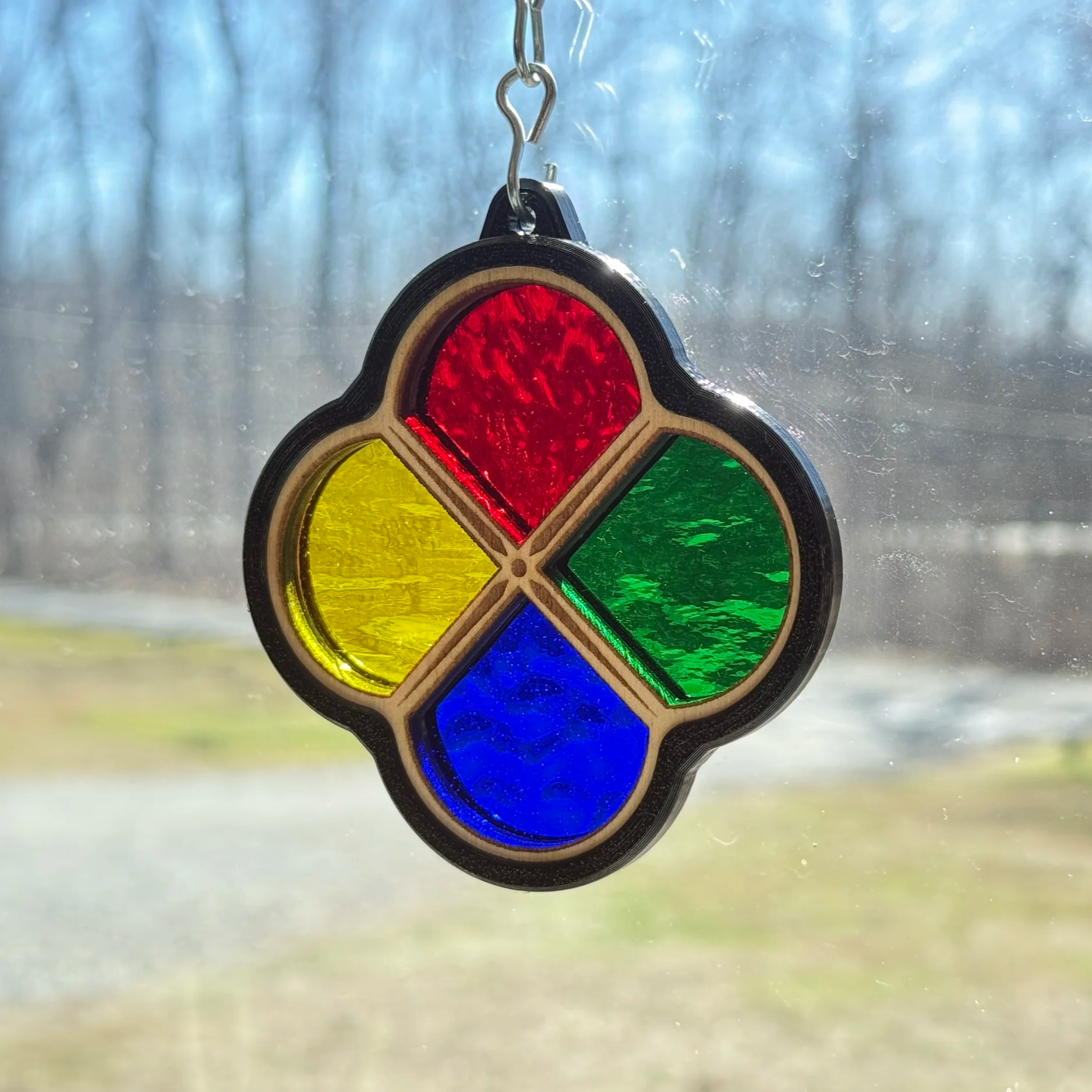 First experiment of the year. This stained glass quatrefoil suncatcher is the 2nd gen. version of experimenting with came of the non-soldered variety. This is 3D printed, engineered came with wood veneer that creates pockets of light highlighting each hand-cut glass piece—giving them a thicker appearance.